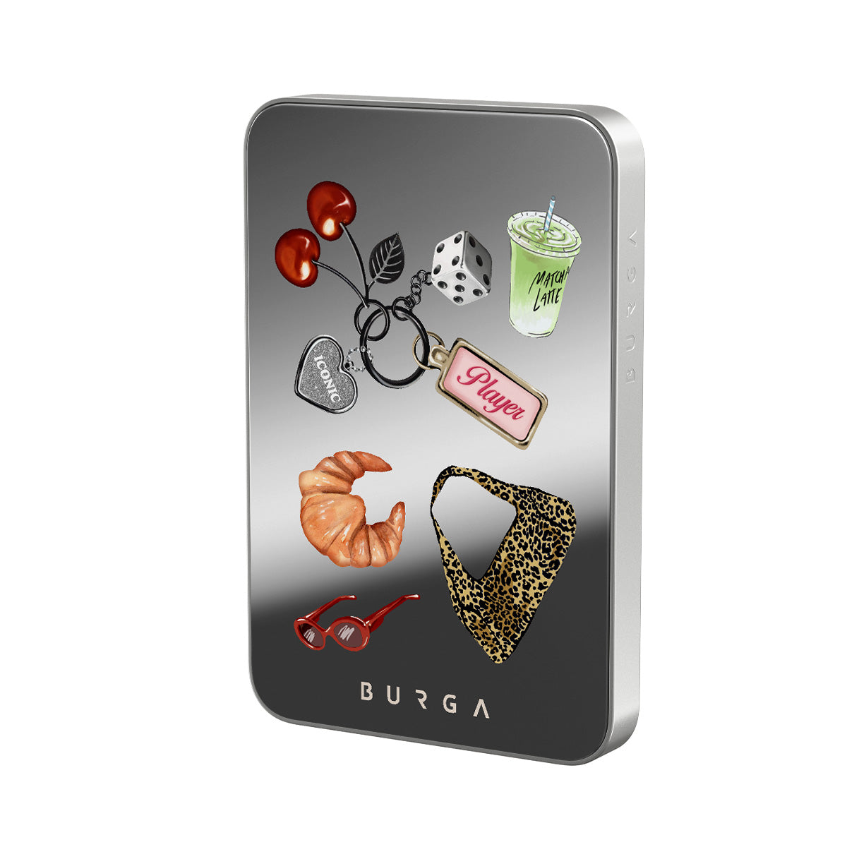 Questo design include: occhiali da sole rossi, rossetto rosso, matcha verde, croissant, dadi neri, borsa maculata leopardata, portachiavi con cuore d’argento, ciliegie, dadi e tag "Player"