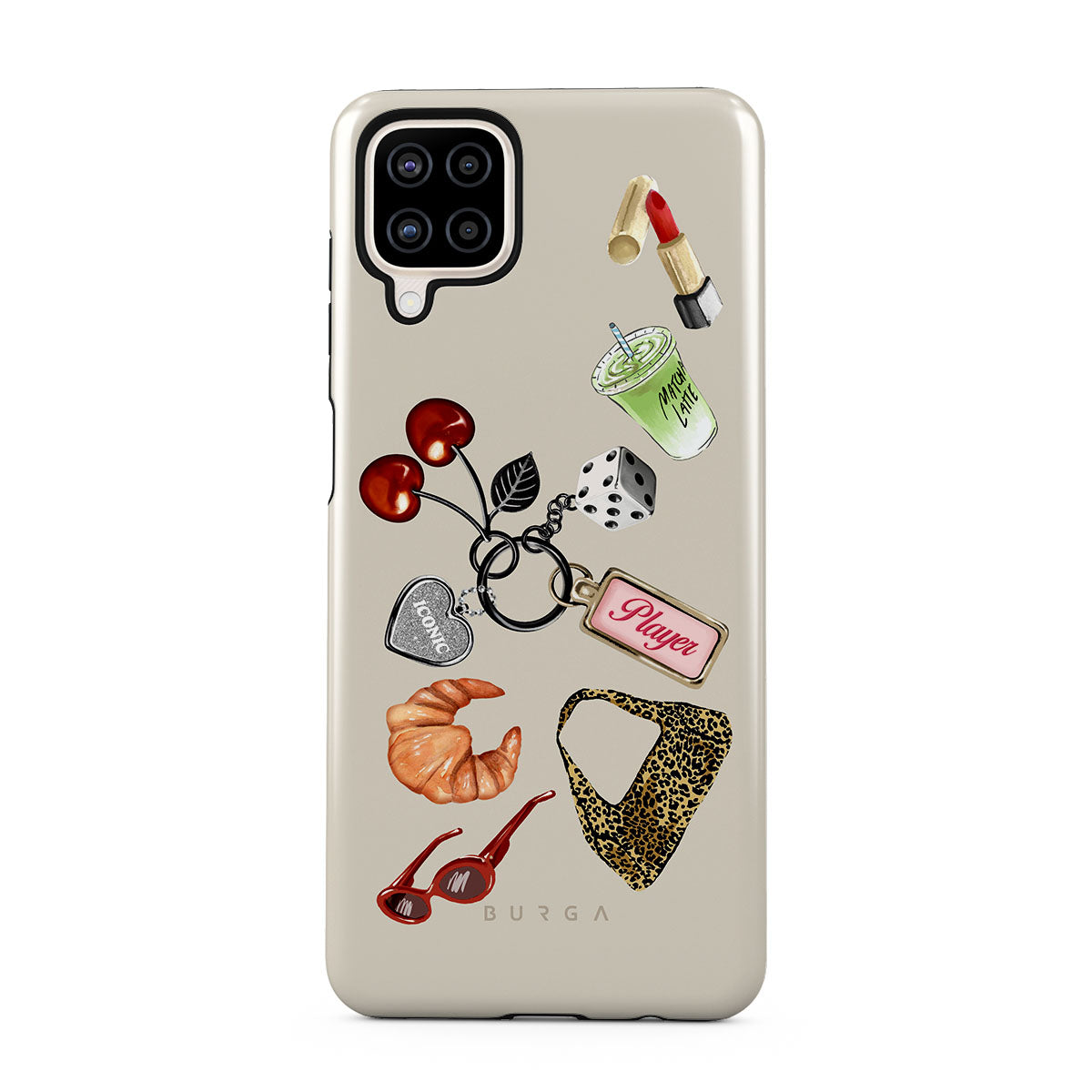 Questo design include: occhiali da sole rossi, rossetto rosso, matcha verde, croissant, dadi neri, borsa maculata leopardata, portachiavi con cuore d’argento, ciliegie, dadi e tag "Player".