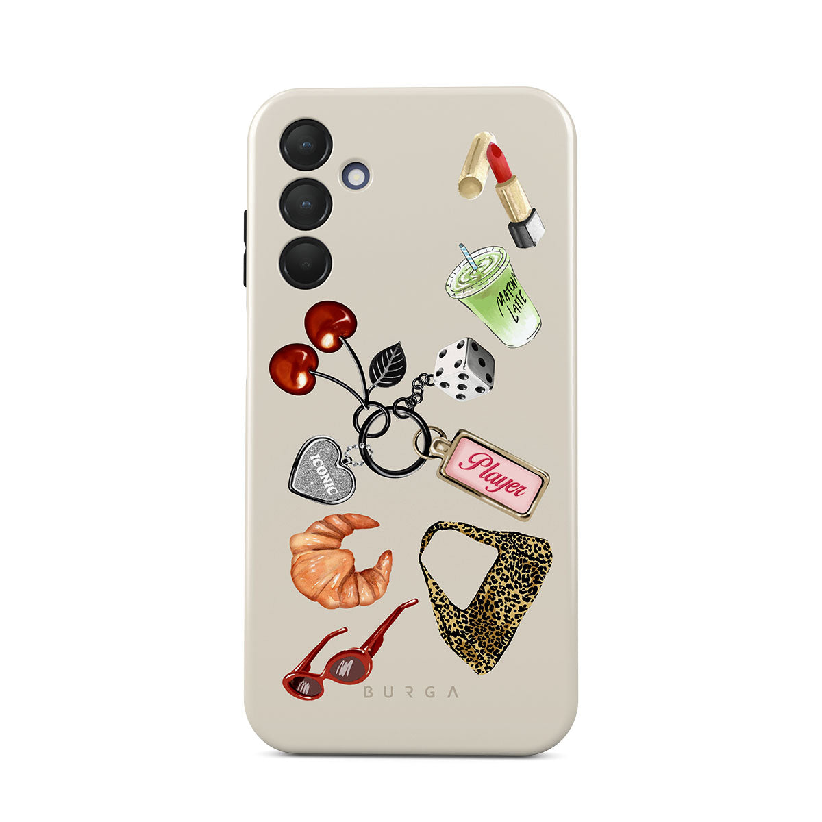 Questo design include: occhiali da sole rossi, rossetto rosso, matcha verde, croissant, dadi neri, borsa maculata leopardata, portachiavi con cuore d’argento, ciliegie, dadi e tag "Player".