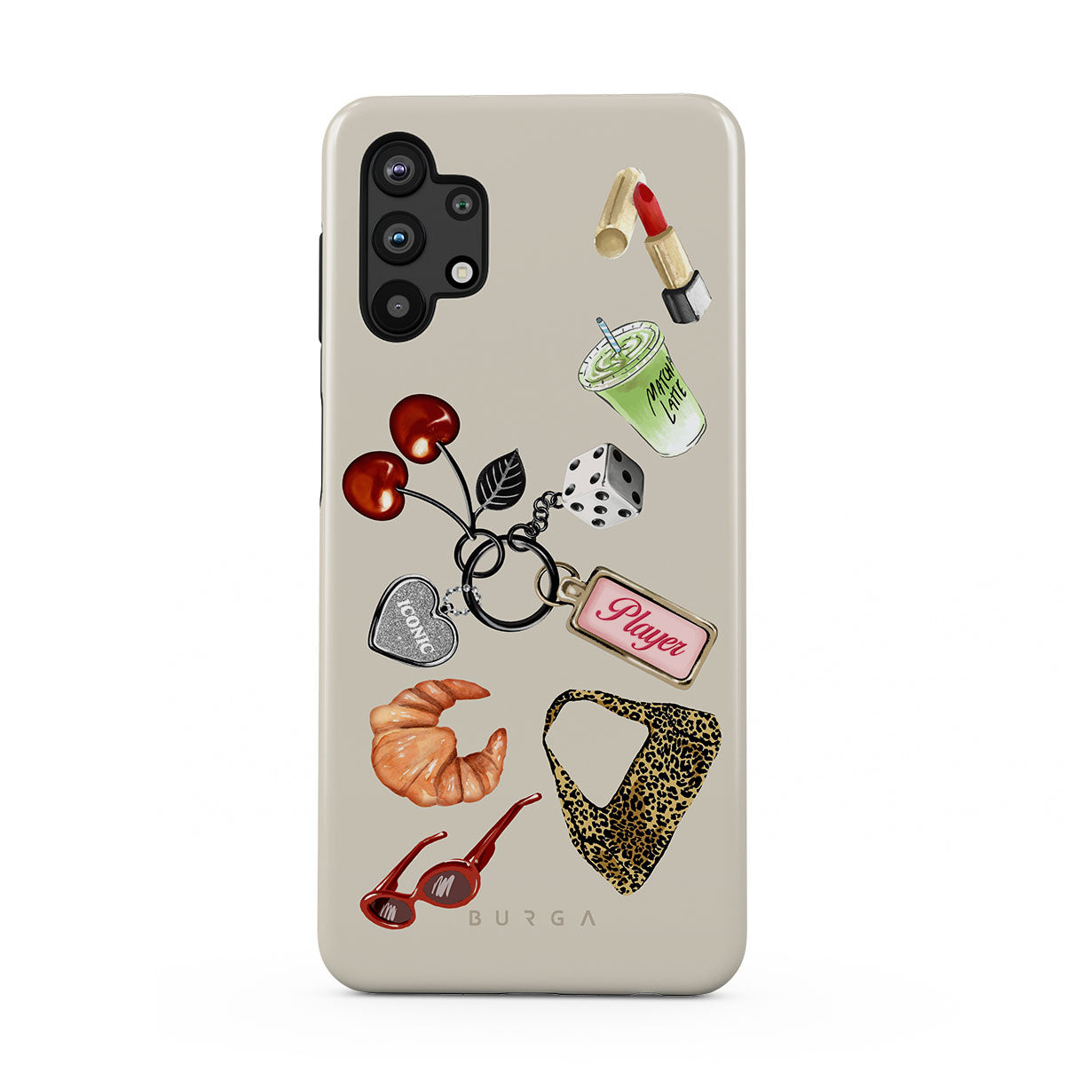 Questo design include: occhiali da sole rossi, rossetto rosso, matcha verde, croissant, dadi neri, borsa maculata leopardata, portachiavi con cuore d’argento, ciliegie, dadi e tag "Player".