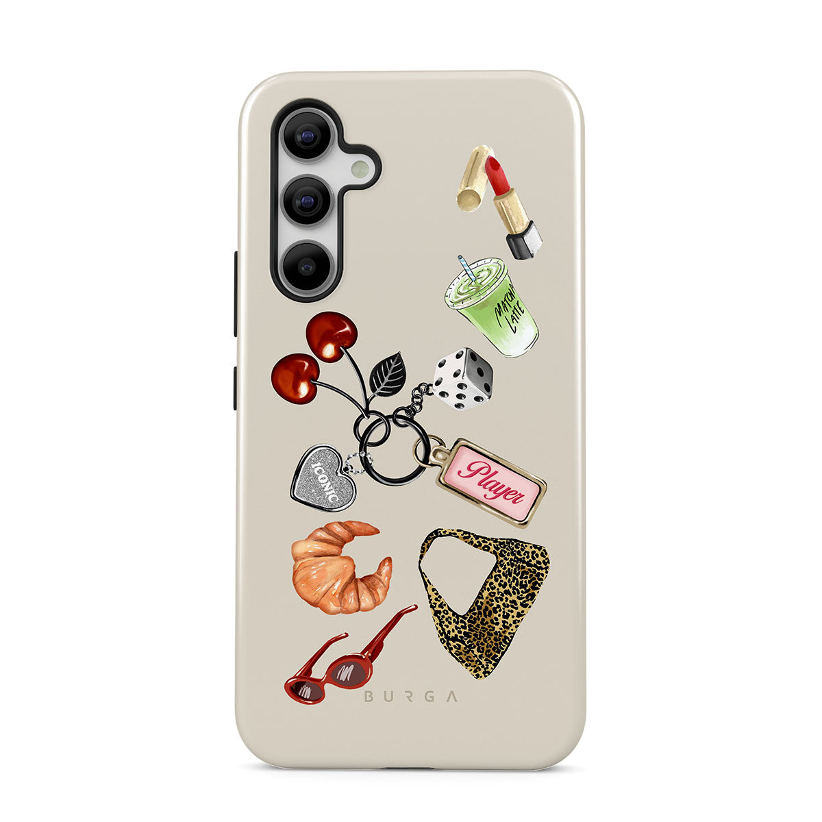Questo design include: occhiali da sole rossi, rossetto rosso, matcha verde, croissant, dadi neri, borsa maculata leopardata, portachiavi con cuore d’argento, ciliegie, dadi e tag "Player".