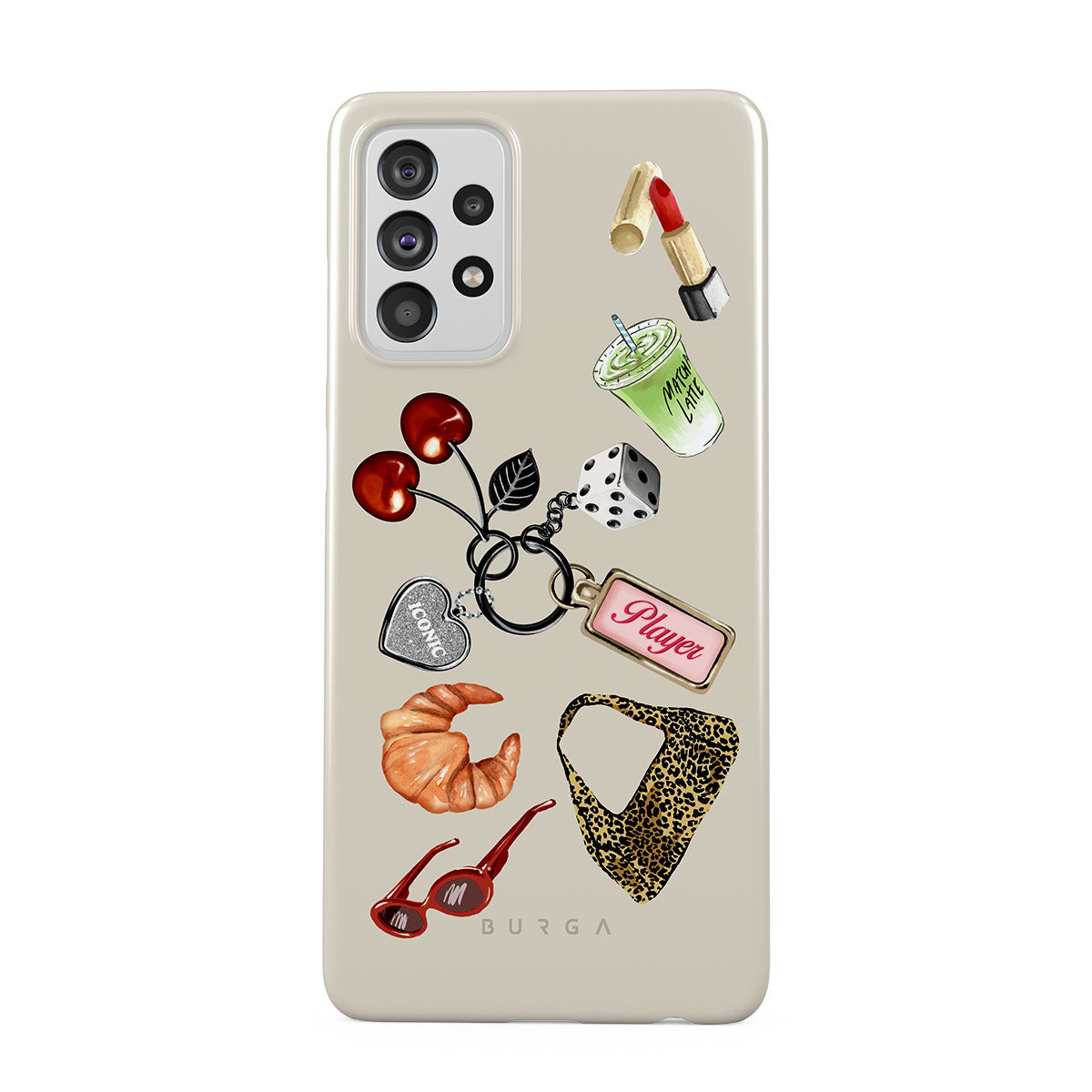 Questo design include: occhiali da sole rossi, rossetto rosso, matcha verde, croissant, dadi neri, borsa maculata leopardata, portachiavi con cuore d’argento, ciliegie, dadi e tag "Player".