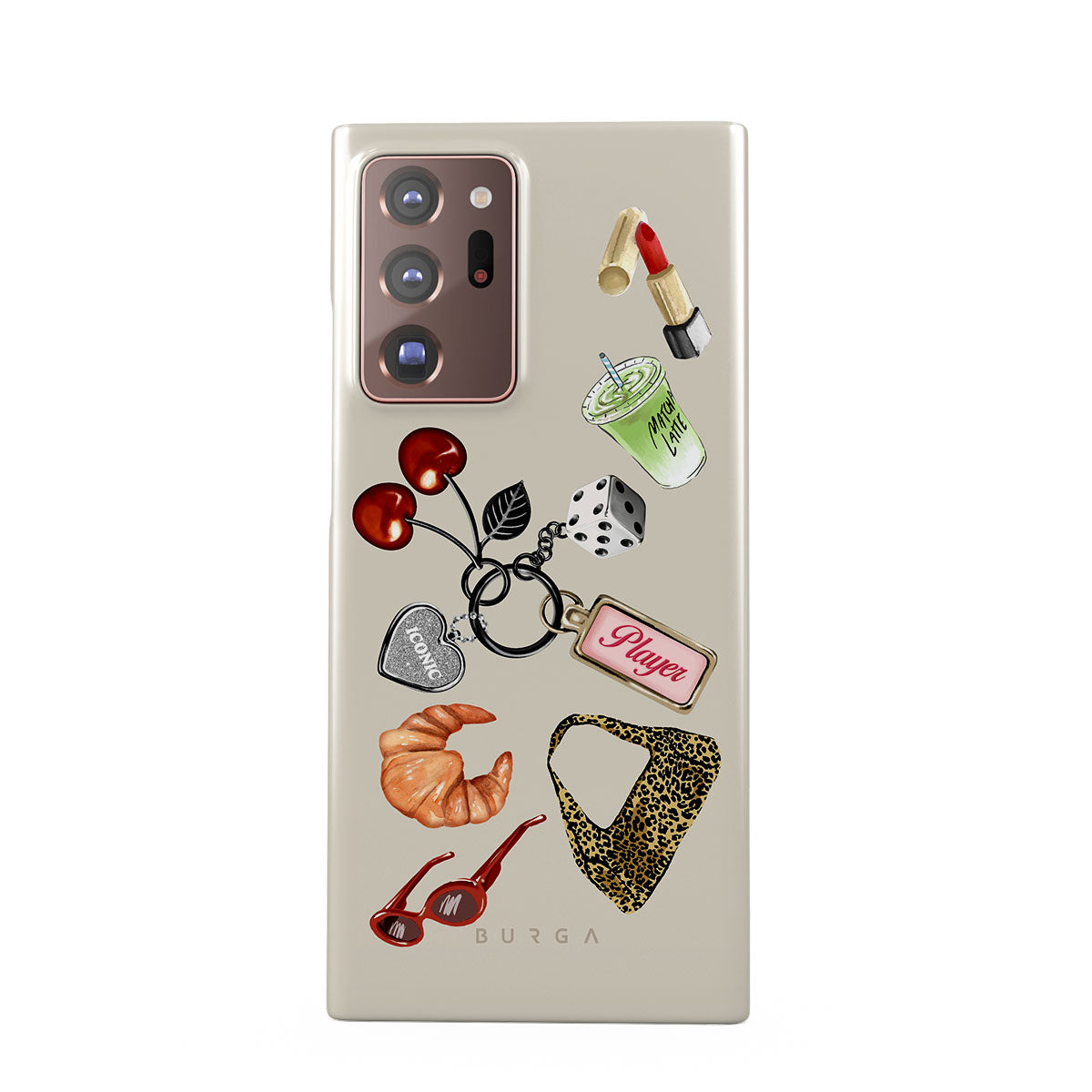 Questo design include: occhiali da sole rossi, rossetto rosso, matcha verde, croissant, dadi neri, borsa maculata leopardata, portachiavi con cuore d’argento, ciliegie, dadi e tag "Player".