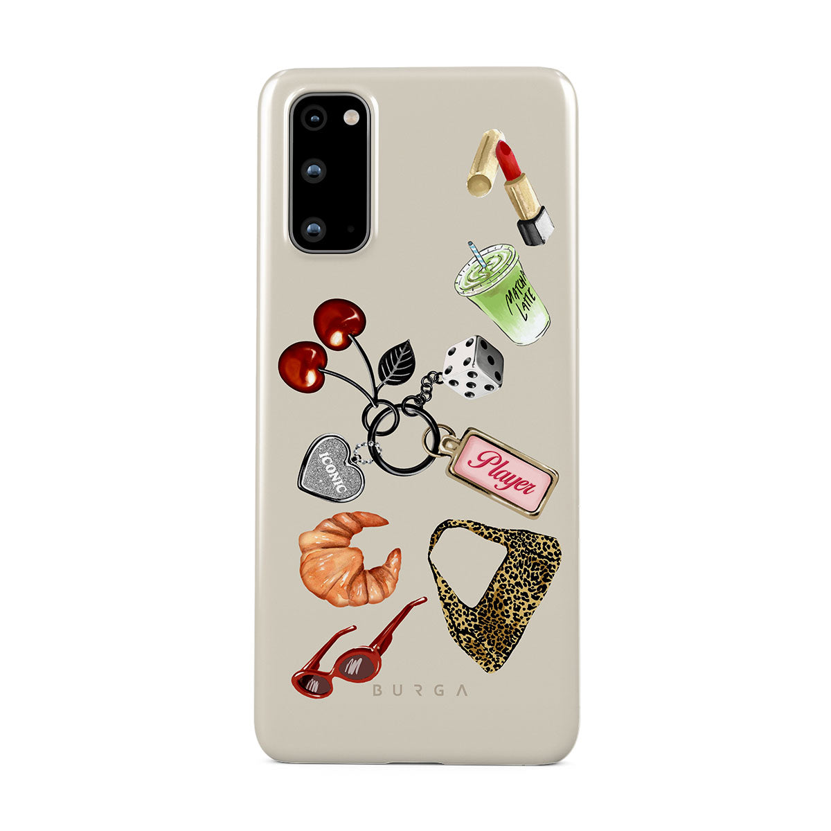 Questo design include: occhiali da sole rossi, rossetto rosso, matcha verde, croissant, dadi neri, borsa maculata leopardata, portachiavi con cuore d’argento, ciliegie, dadi e tag "Player".
