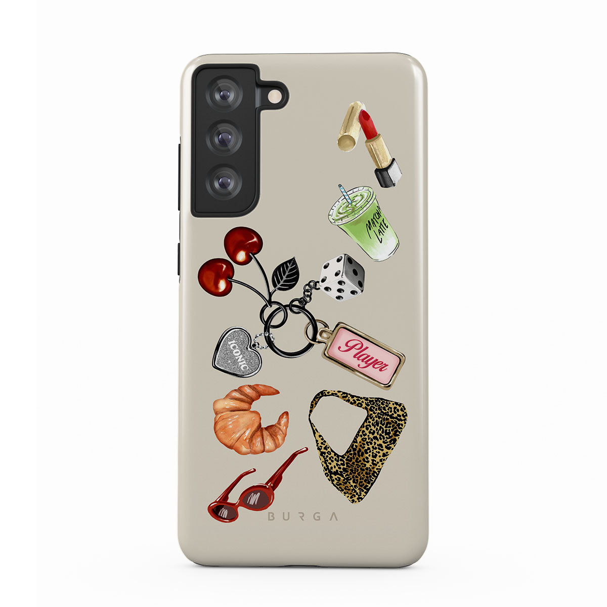 Questo design include: occhiali da sole rossi, rossetto rosso, matcha verde, croissant, dadi neri, borsa maculata leopardata, portachiavi con cuore d’argento, ciliegie, dadi e tag "Player".