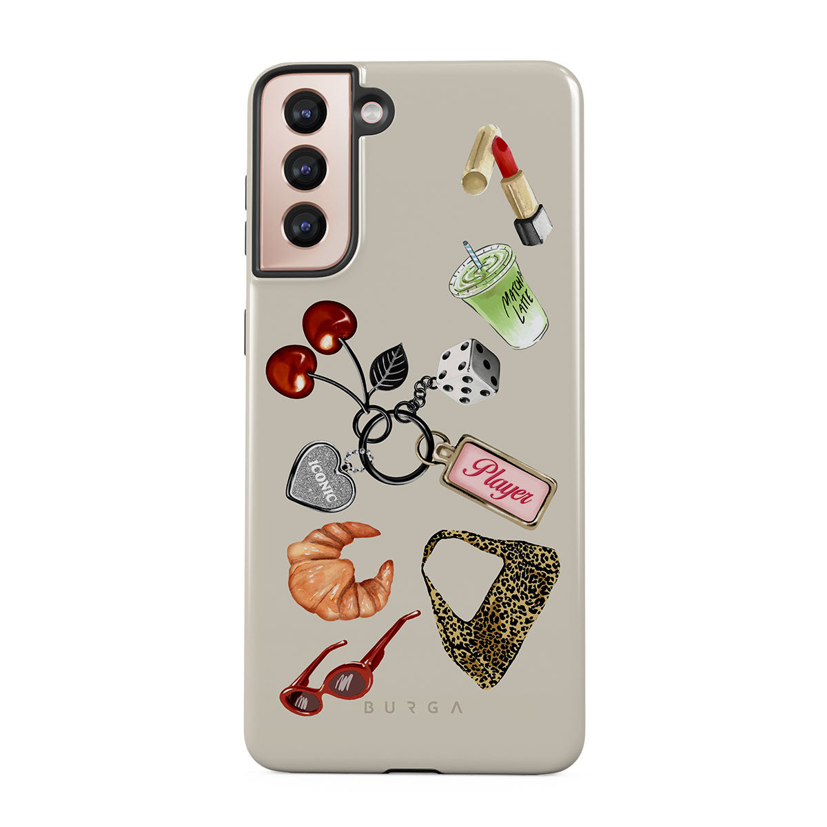 Questo design include: occhiali da sole rossi, rossetto rosso, matcha verde, croissant, dadi neri, borsa maculata leopardata, portachiavi con cuore d’argento, ciliegie, dadi e tag "Player".