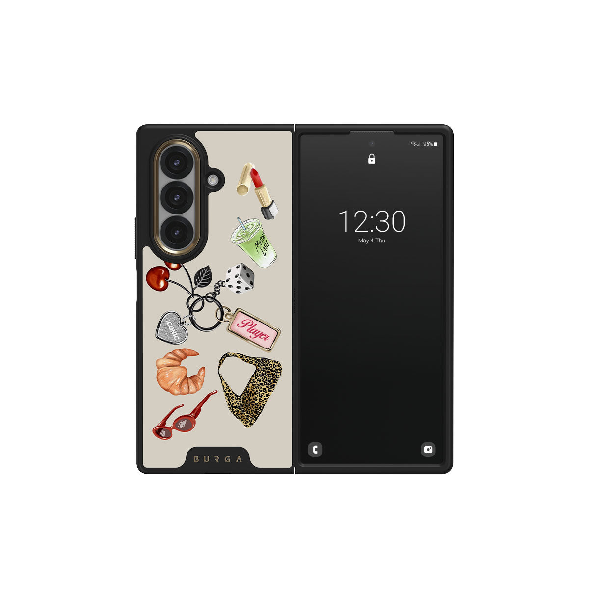 Questo design include: occhiali da sole rossi, rossetto rosso, matcha verde, croissant, dadi neri, borsa maculata leopardata, portachiavi con cuore d’argento, ciliegie, dadi e tag "Player".