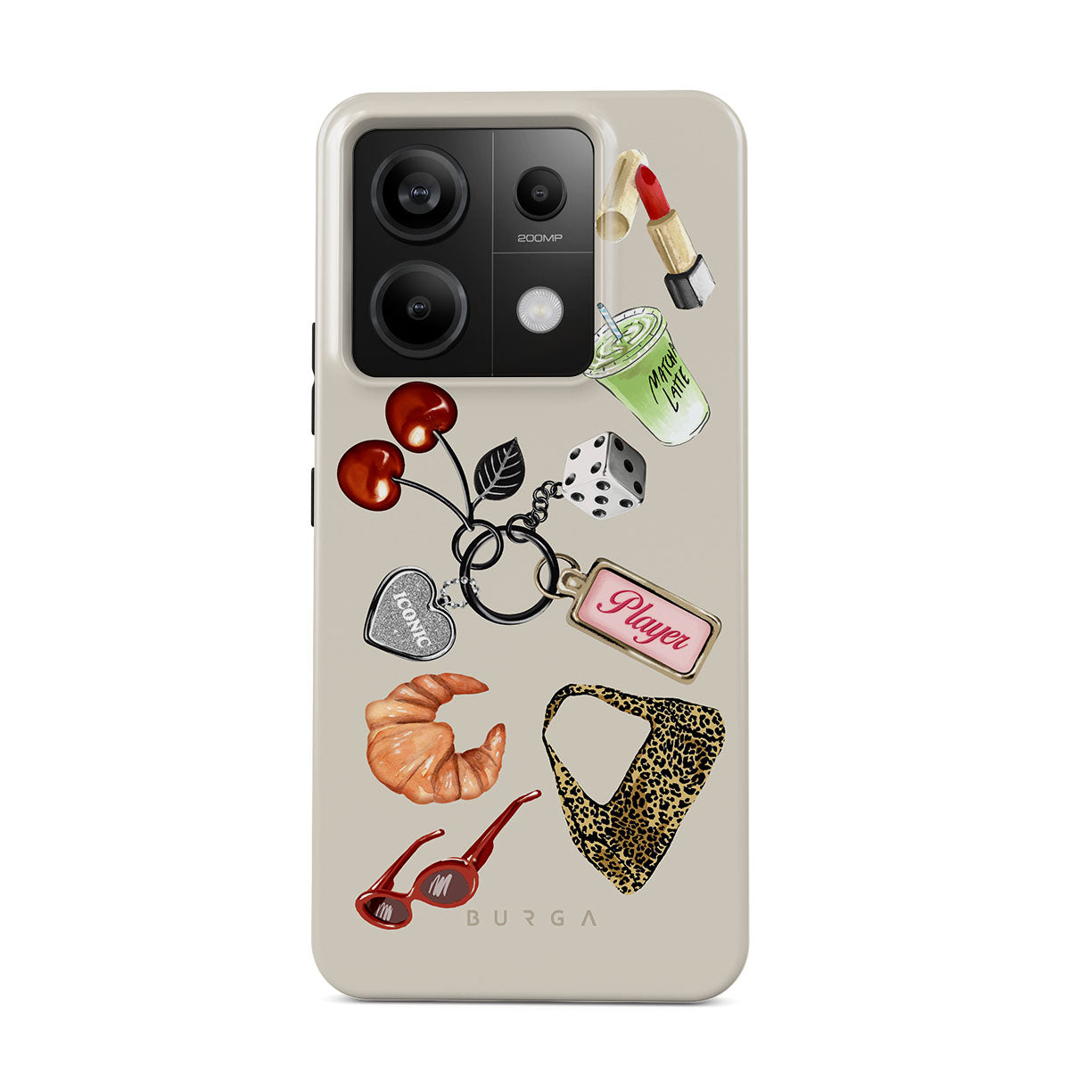 Questo design include: occhiali da sole rossi, rossetto rosso, matcha verde, croissant, dadi neri, borsa maculata leopardata, portachiavi con cuore d’argento, ciliegie, dadi e tag "Player".