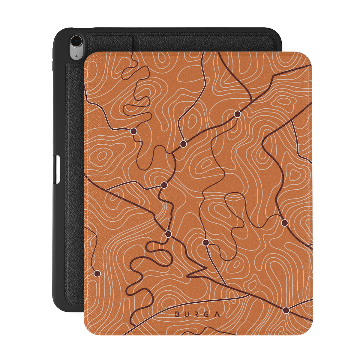 Questo design include: colore arancione, motivo astratto ispirato alle mappe