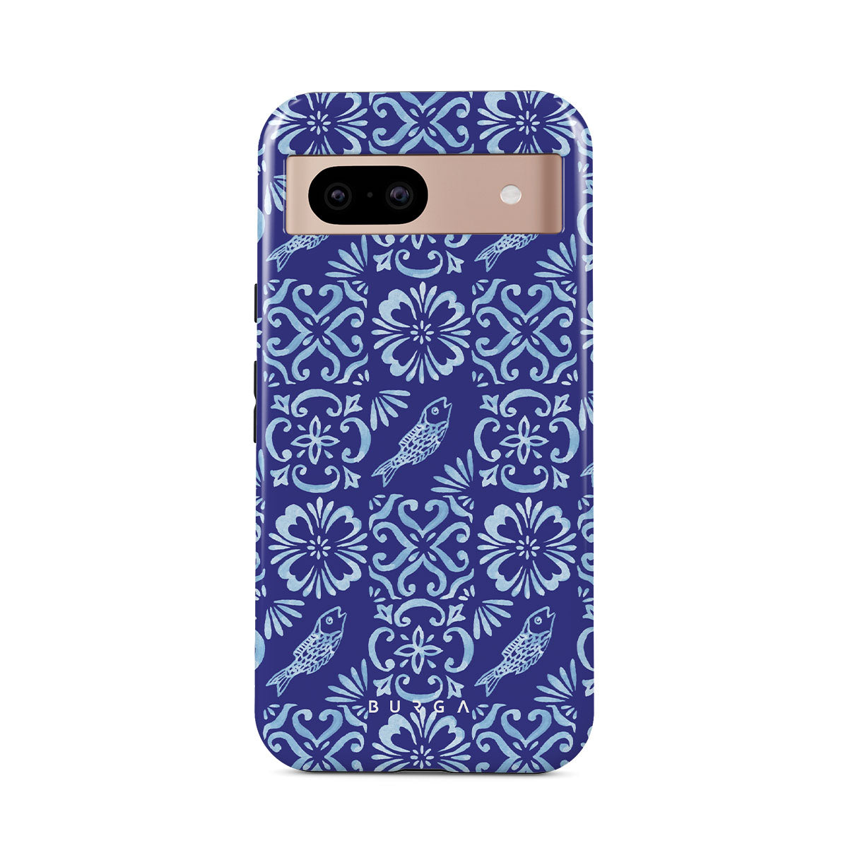 Questo design include: motivi di piastrelle portoghesi, blu profondi, motivi floreali, fiori, pesci