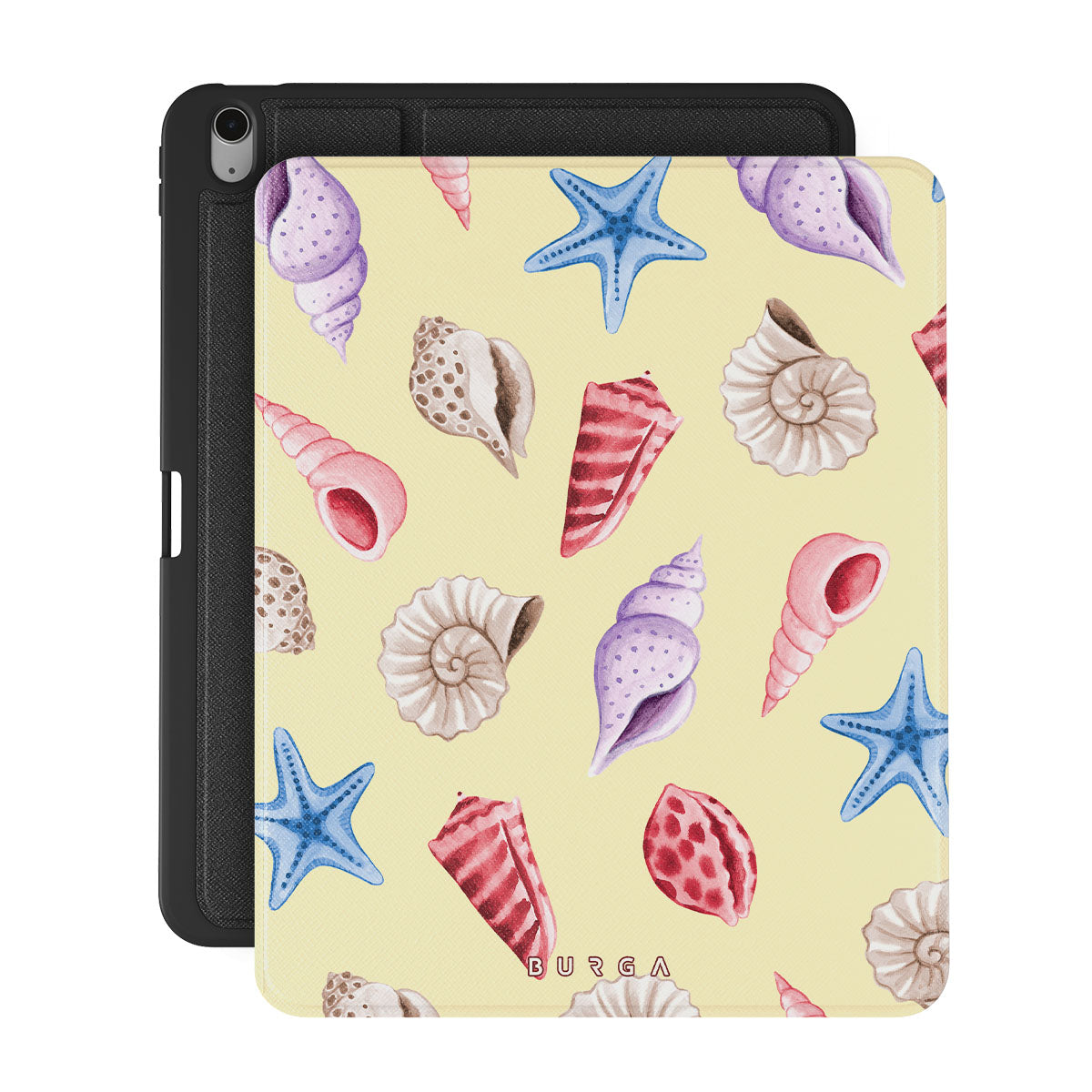 Questo design include: conchiglie, stelle marine, sfondo giallo pastello, tema marino.