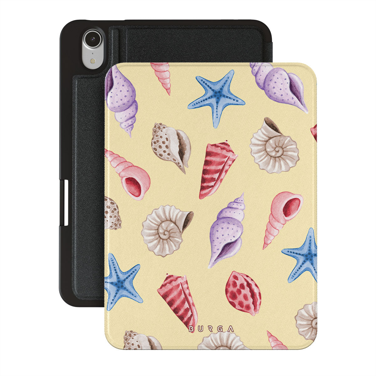 Questo design include: conchiglie, stelle marine, sfondo giallo pastello, tema marino.