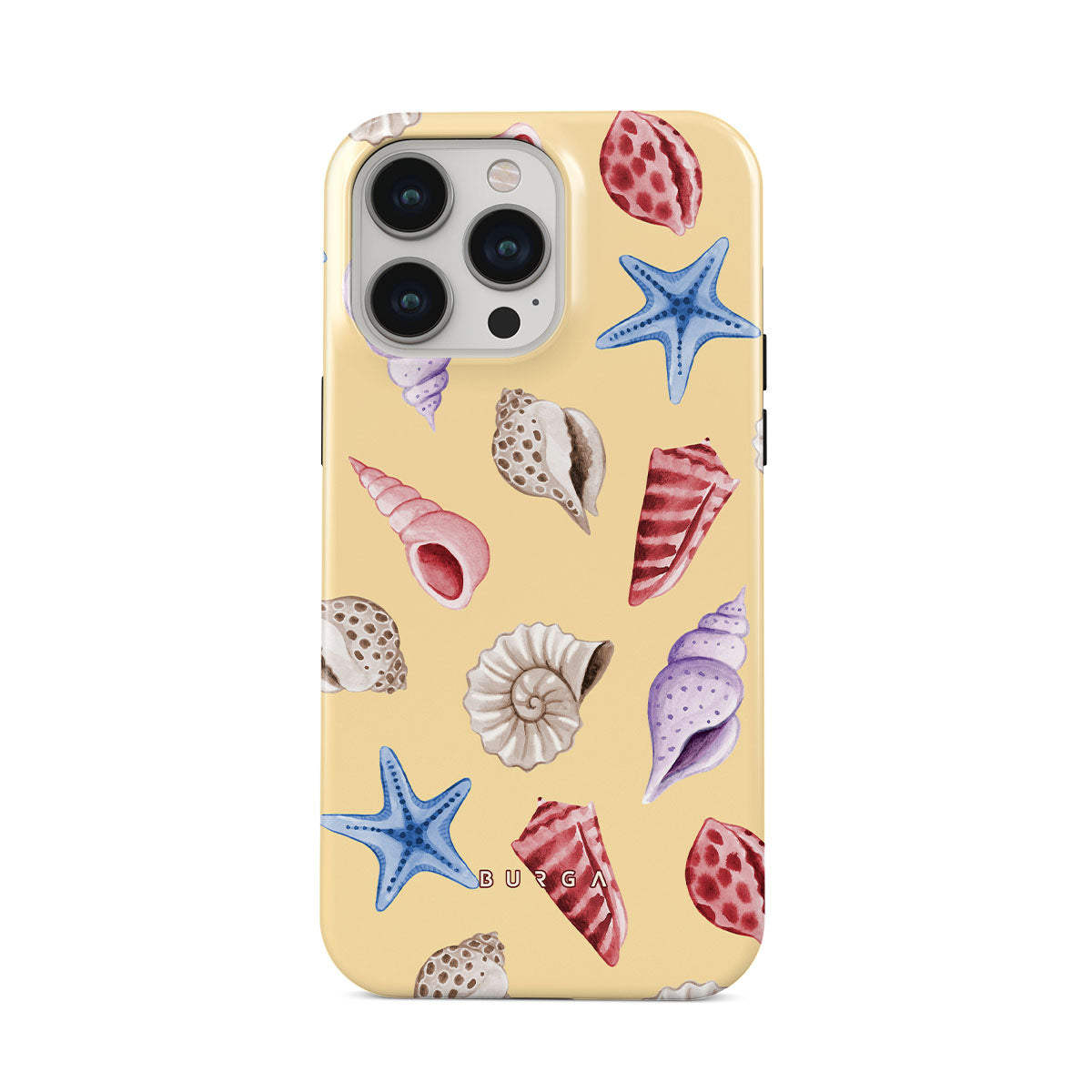 Questo design include: conchiglie, stelle marine, sfondo giallo pastello, tema marino.