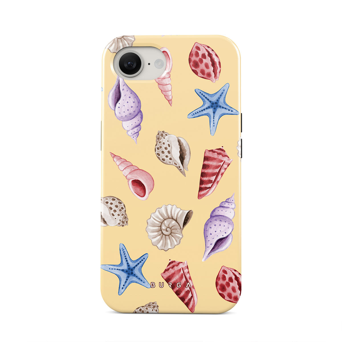 Questo design include: conchiglie, stelle marine, sfondo giallo pastello, tema marino.