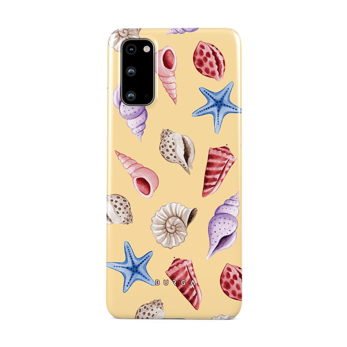 Questo design include: conchiglie, stelle marine, sfondo giallo pastello, tema marino.