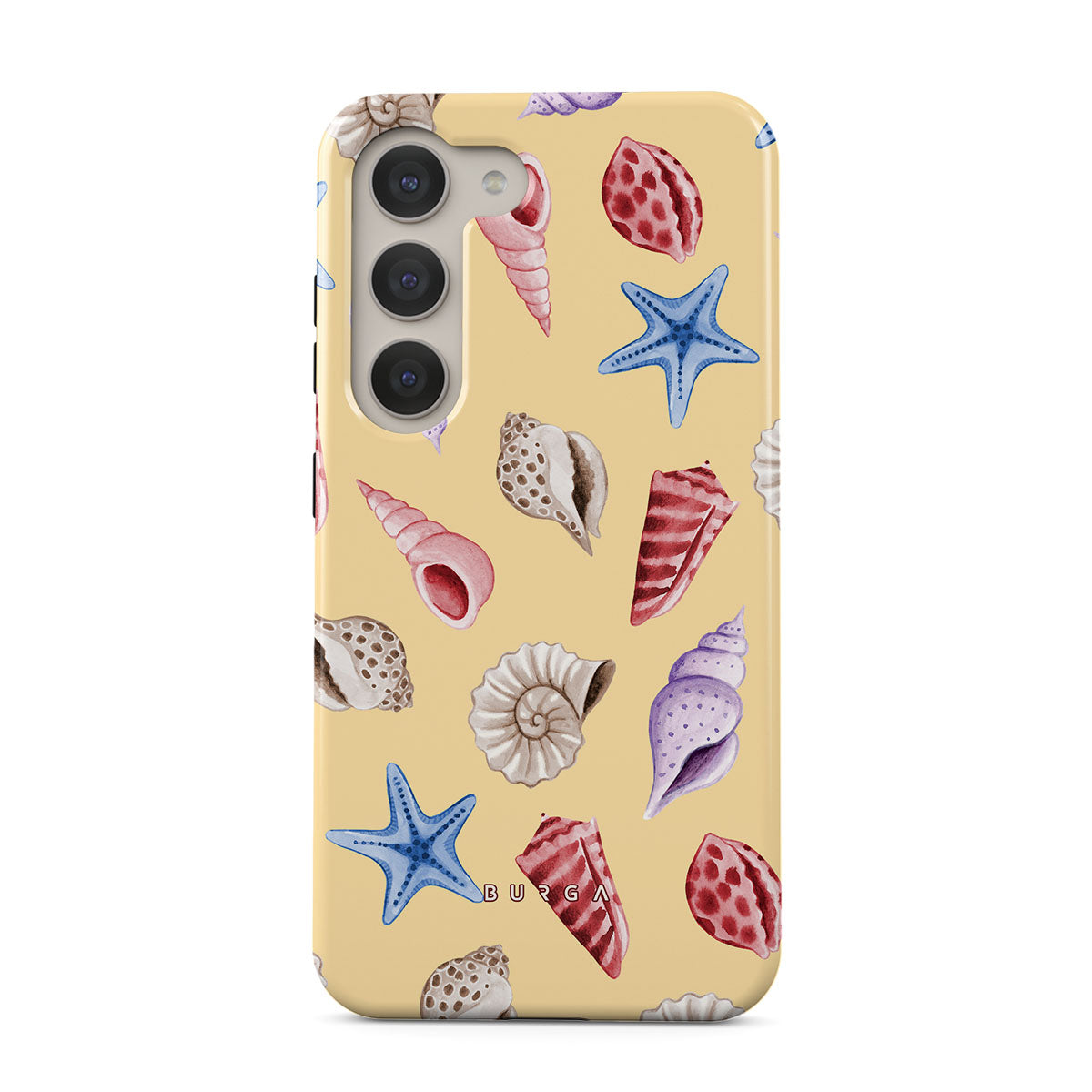 Questo design include: conchiglie, stelle marine, sfondo giallo pastello, tema marino.