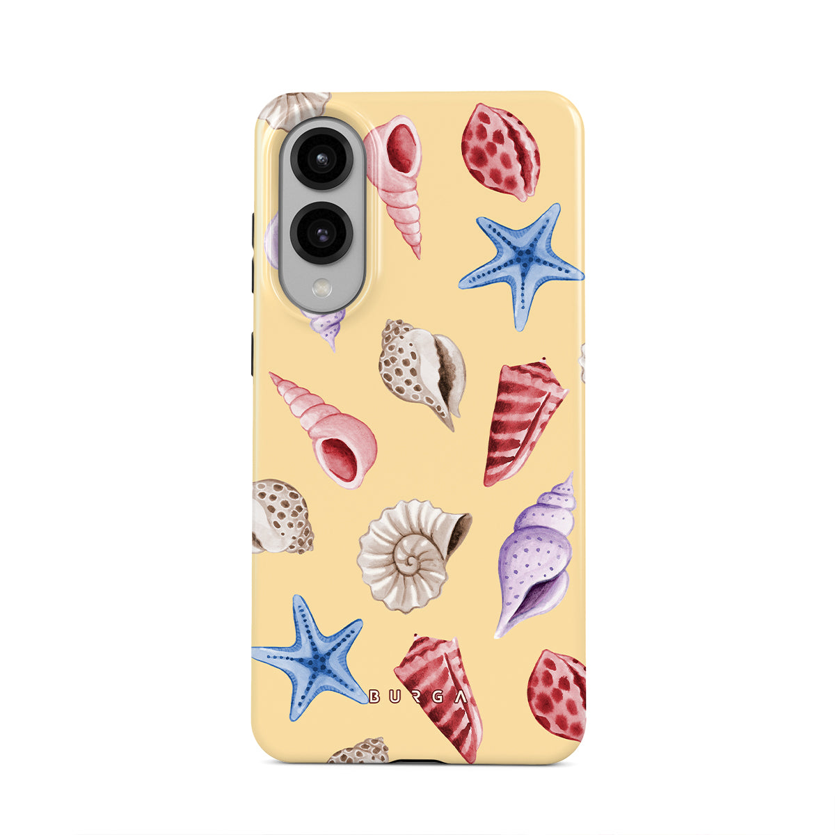 Questo design include: conchiglie, stelle marine, sfondo giallo pastello, tema marino.