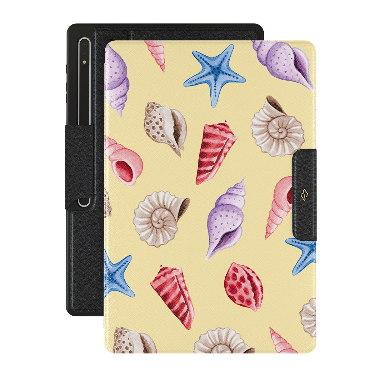 Questo design include: conchiglie, stelle marine, sfondo giallo pastello, tema marino.