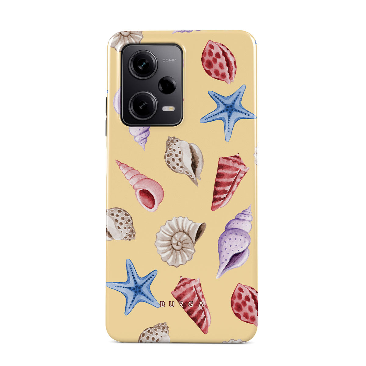 Questo design include: conchiglie, stelle marine, sfondo giallo pastello, tema marino.