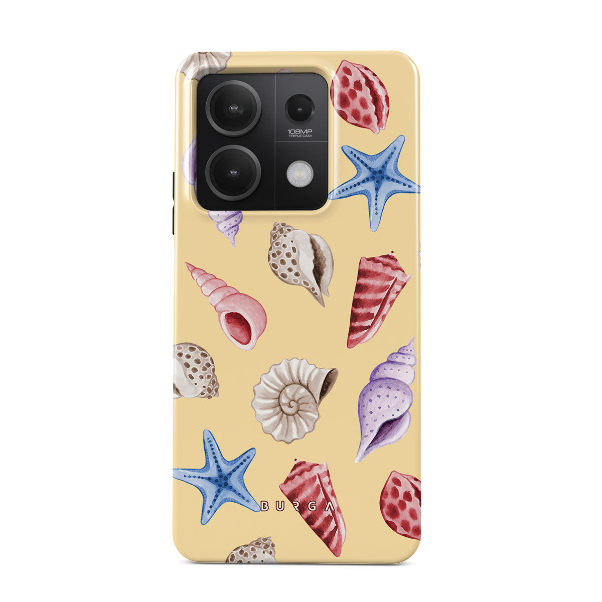 Questo design include: conchiglie, stelle marine, sfondo giallo pastello, tema marino.
