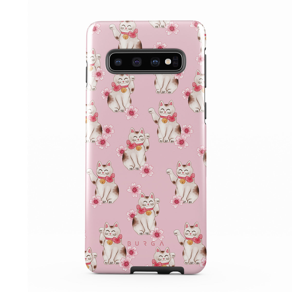 Questo design include: gatti portafortuna maneki neko, petali di ciliegio, motivi giapponesi kawaii