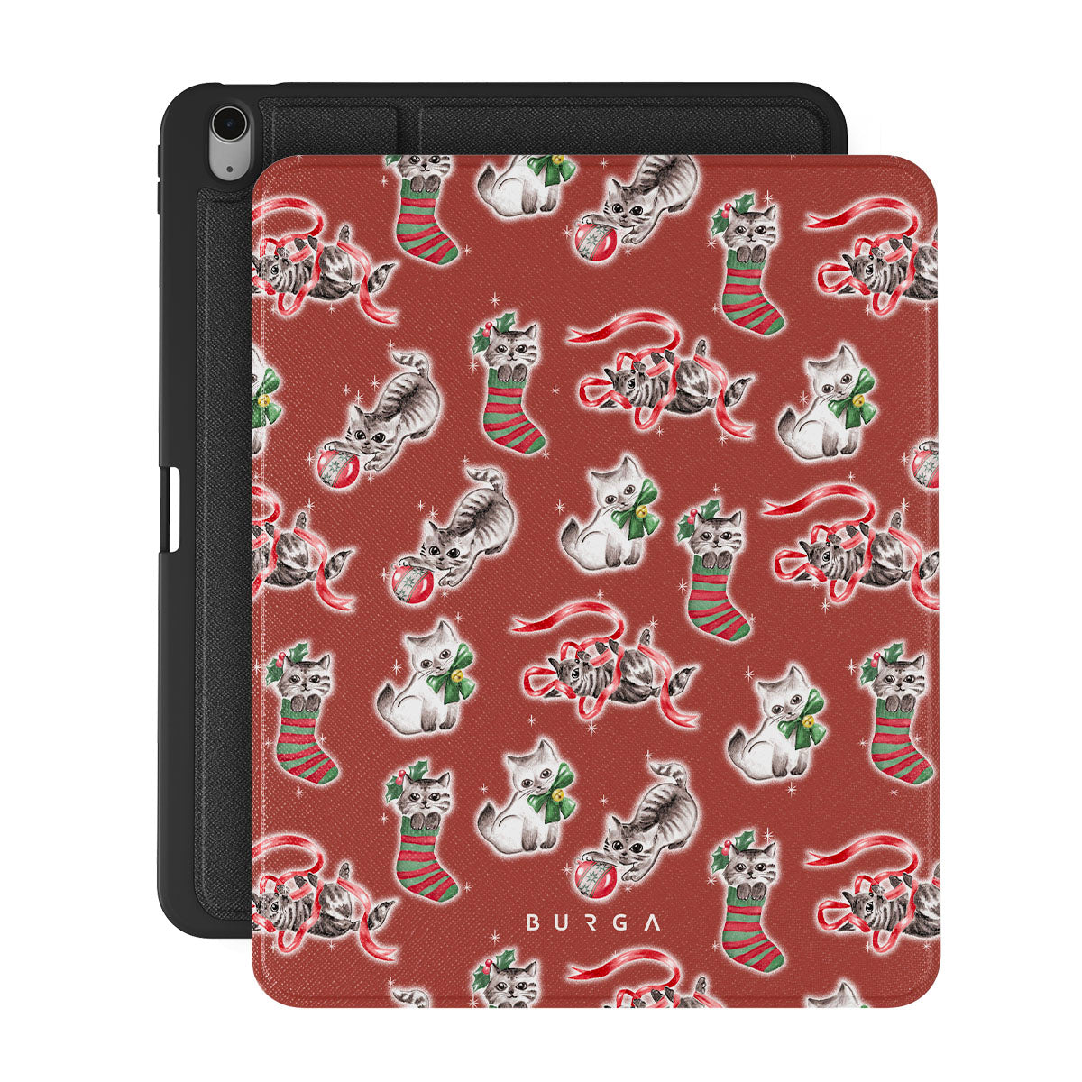 Questo design include: gatti, calze natalizie, gattini, motivo rosso e verde, gatti giocosi, decorazioni natalizie