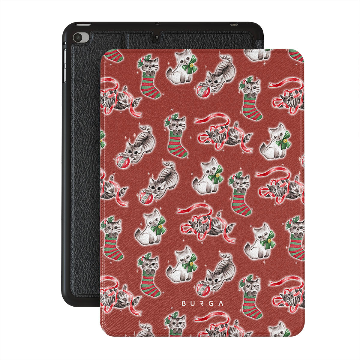 Questo design include: gatti, calze natalizie, gattini, motivo rosso e verde, gatti giocosi, decorazioni natalizie