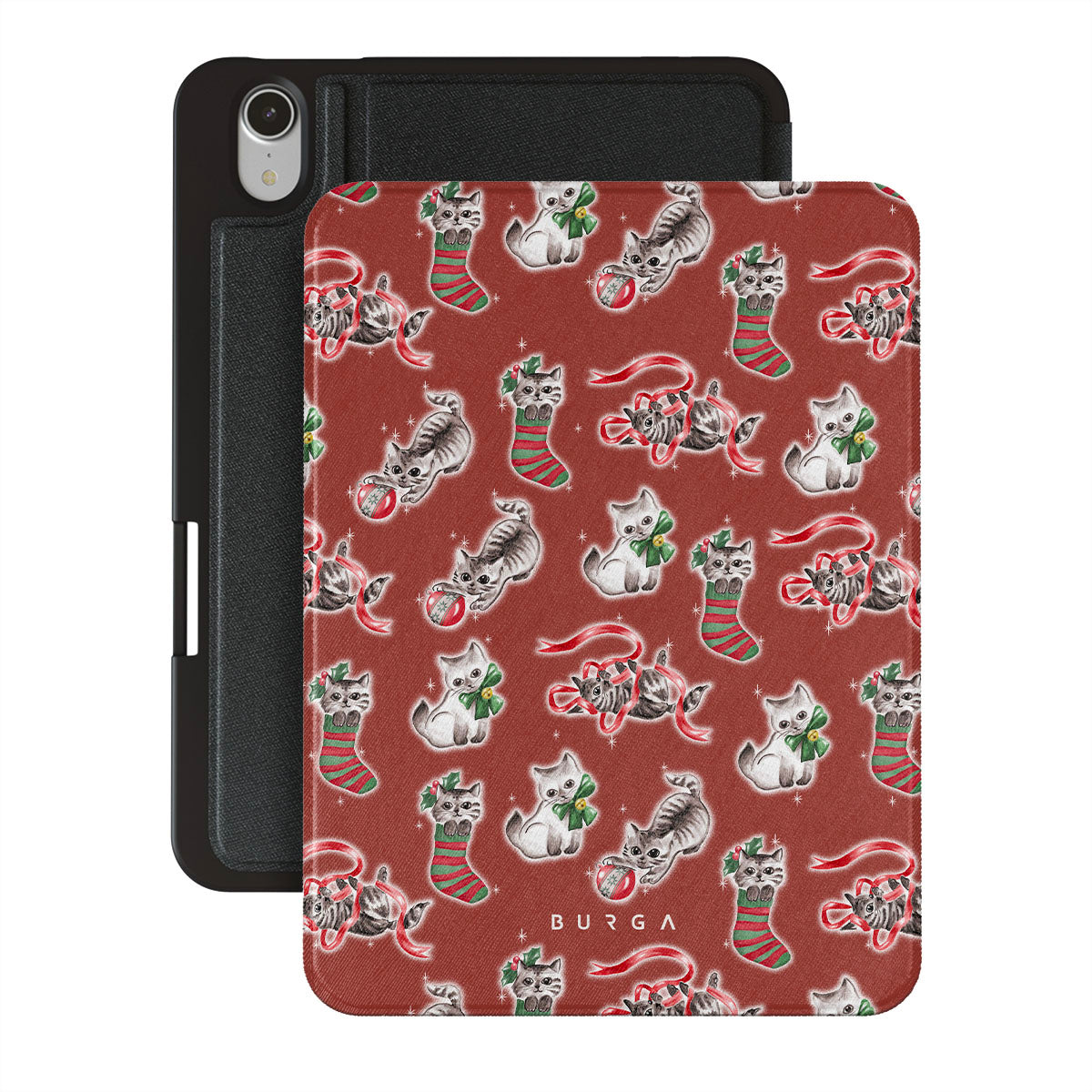 Questo design include: gatti, calze natalizie, gattini, motivo rosso e verde, gatti giocosi, decorazioni natalizie