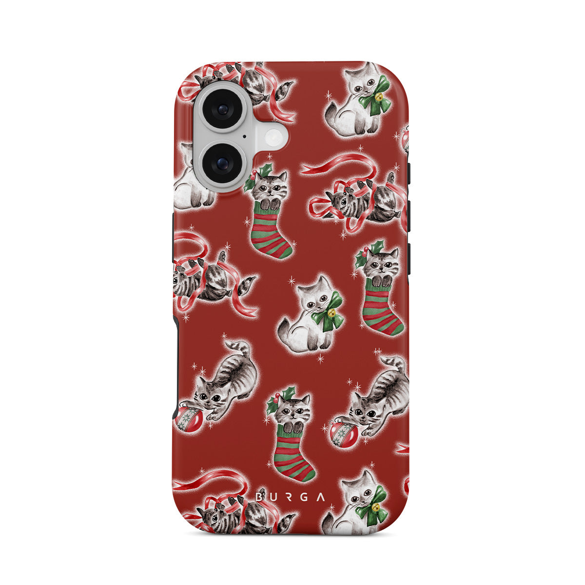 Questo design include: gatti, calze natalizie, gattini, motivo rosso e verde, gatti giocosi, decorazioni natalizie