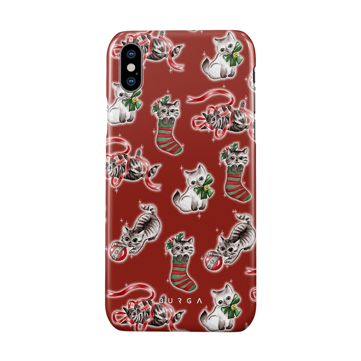 Questo design include: gatti, calze natalizie, gattini, motivo rosso e verde, gatti giocosi, decorazioni natalizie