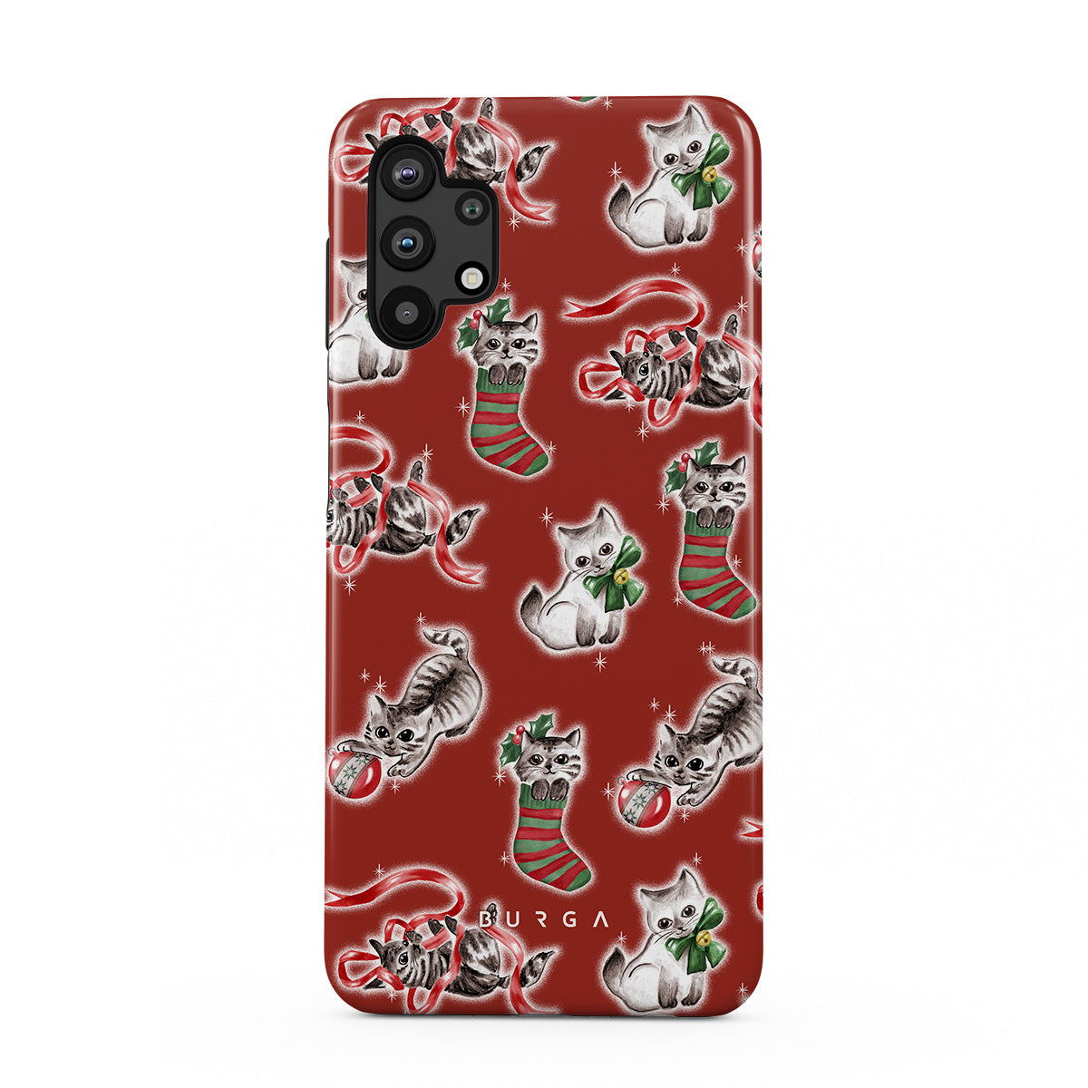 Questo design include: gatti, calze natalizie, gattini, motivo rosso e verde, gatti giocosi, decorazioni natalizie