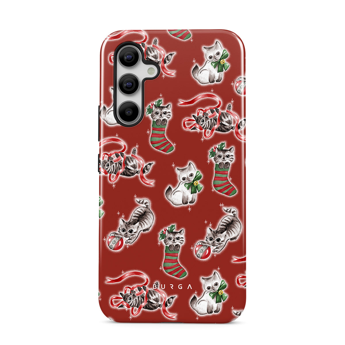 Questo design include: gatti, calze natalizie, gattini, motivo rosso e verde, gatti giocosi, decorazioni natalizie