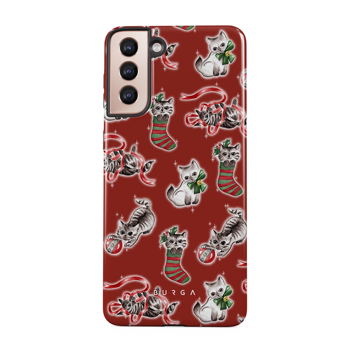 Questo design include: gatti, calze natalizie, gattini, motivo rosso e verde, gatti giocosi, decorazioni natalizie