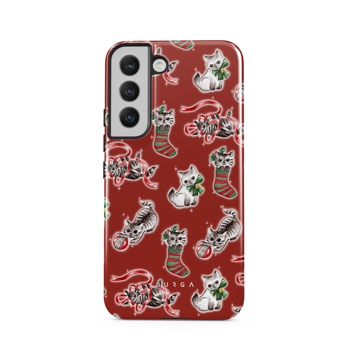 Questo design include: gatti, calze natalizie, gattini, motivo rosso e verde, gatti giocosi, decorazioni natalizie