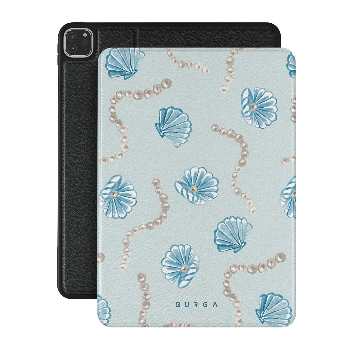 Questo design include: perle, conchiglie, sfondo azzurro chiaro, elementi marini.