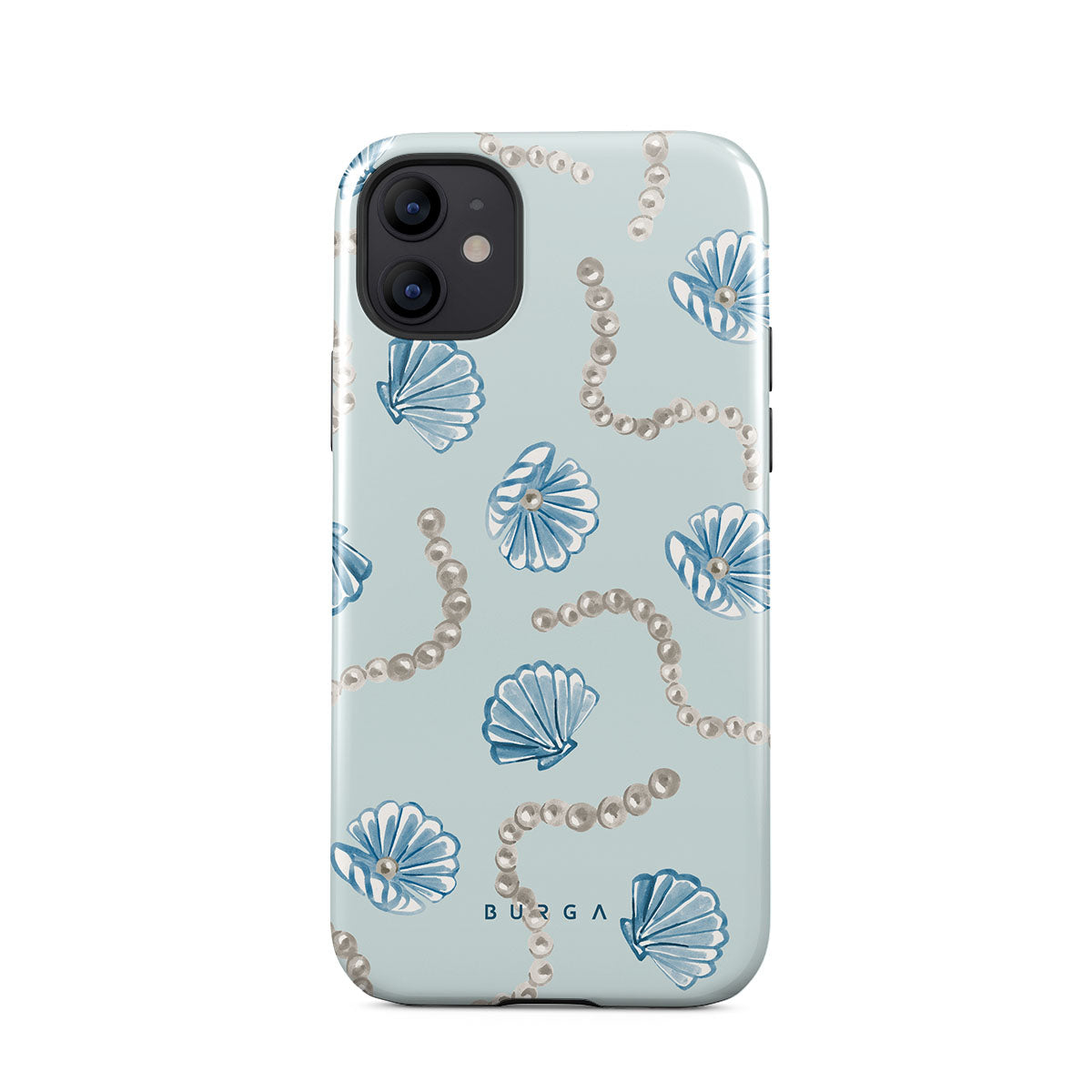 Questo design include: perle, conchiglie, sfondo azzurro chiaro, elementi marini.