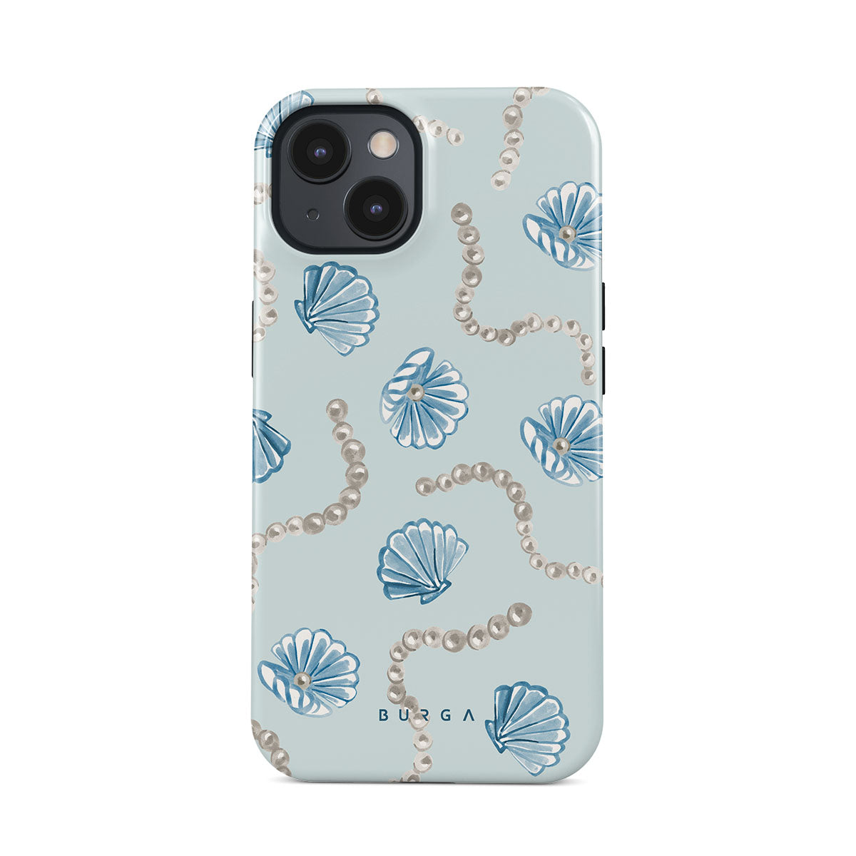 Questo design include: perle, conchiglie, sfondo azzurro chiaro, elementi marini.