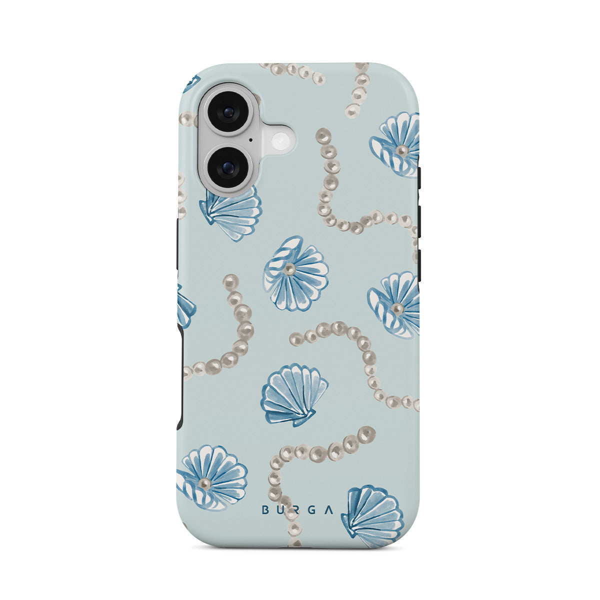Questo design include: perle, conchiglie, sfondo azzurro chiaro, elementi marini.
