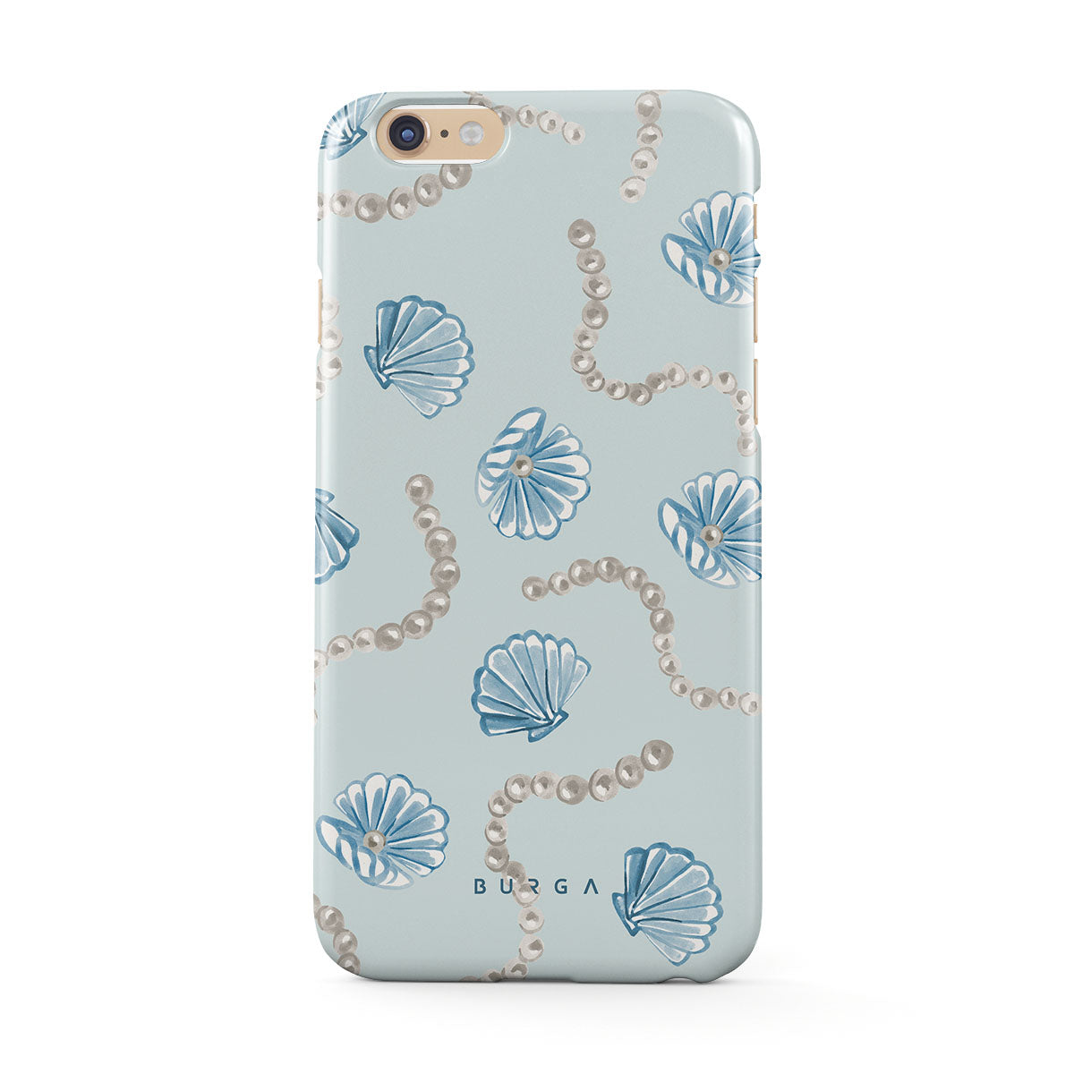 Questo design include: perle, conchiglie, sfondo azzurro chiaro, elementi marini.
