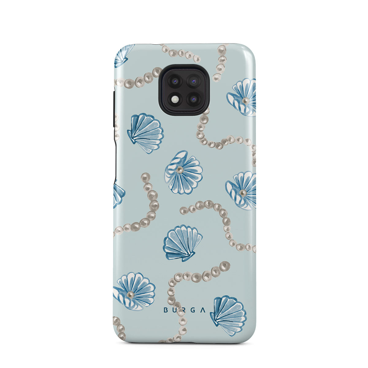 Questo design include: perle, conchiglie, sfondo azzurro chiaro, elementi marini.