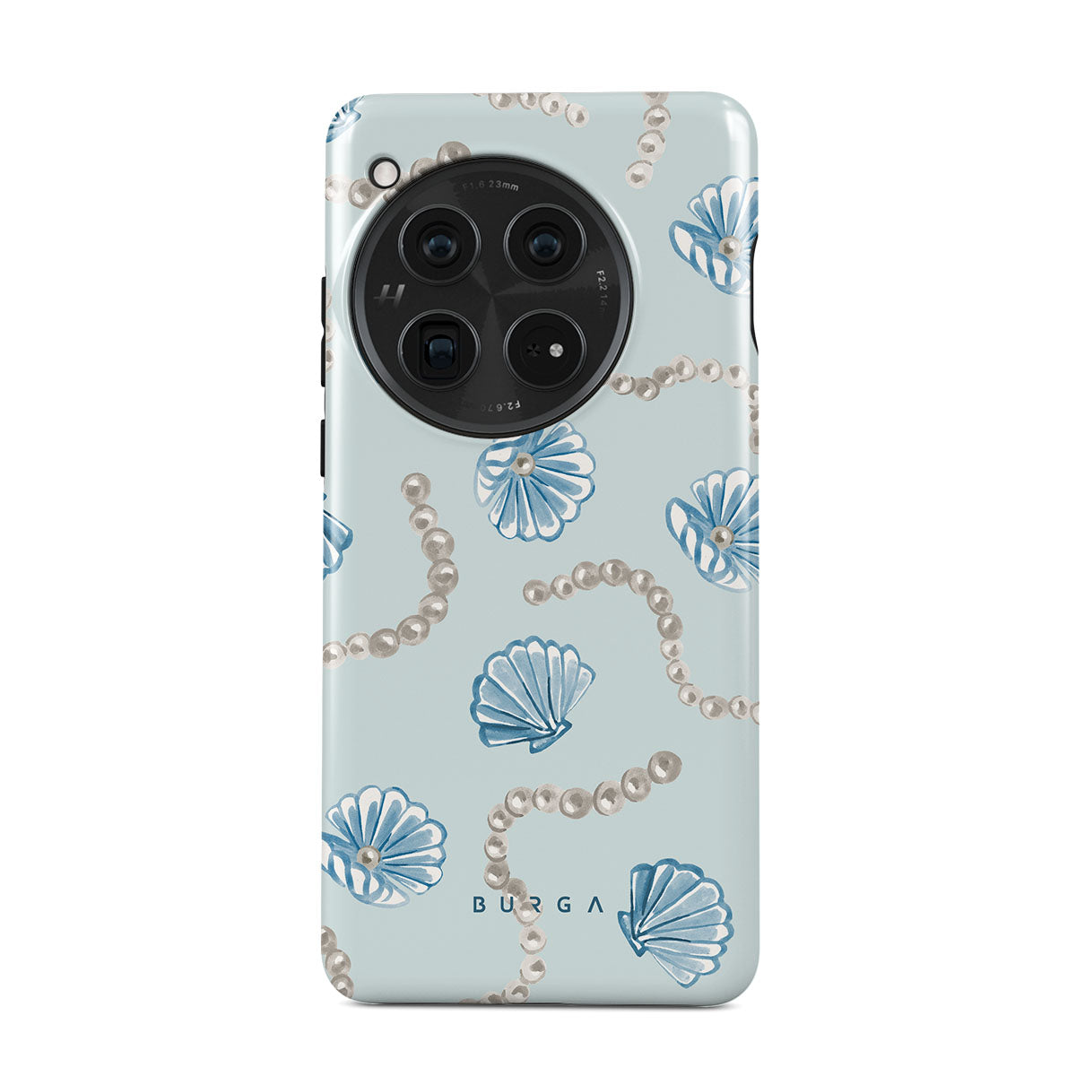 Questo design include: perle, conchiglie, sfondo azzurro chiaro, elementi marini.