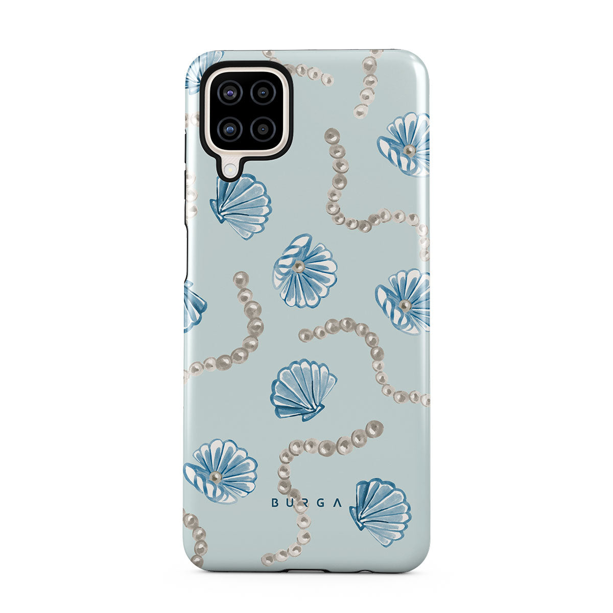 Questo design include: perle, conchiglie, sfondo azzurro chiaro, elementi marini.