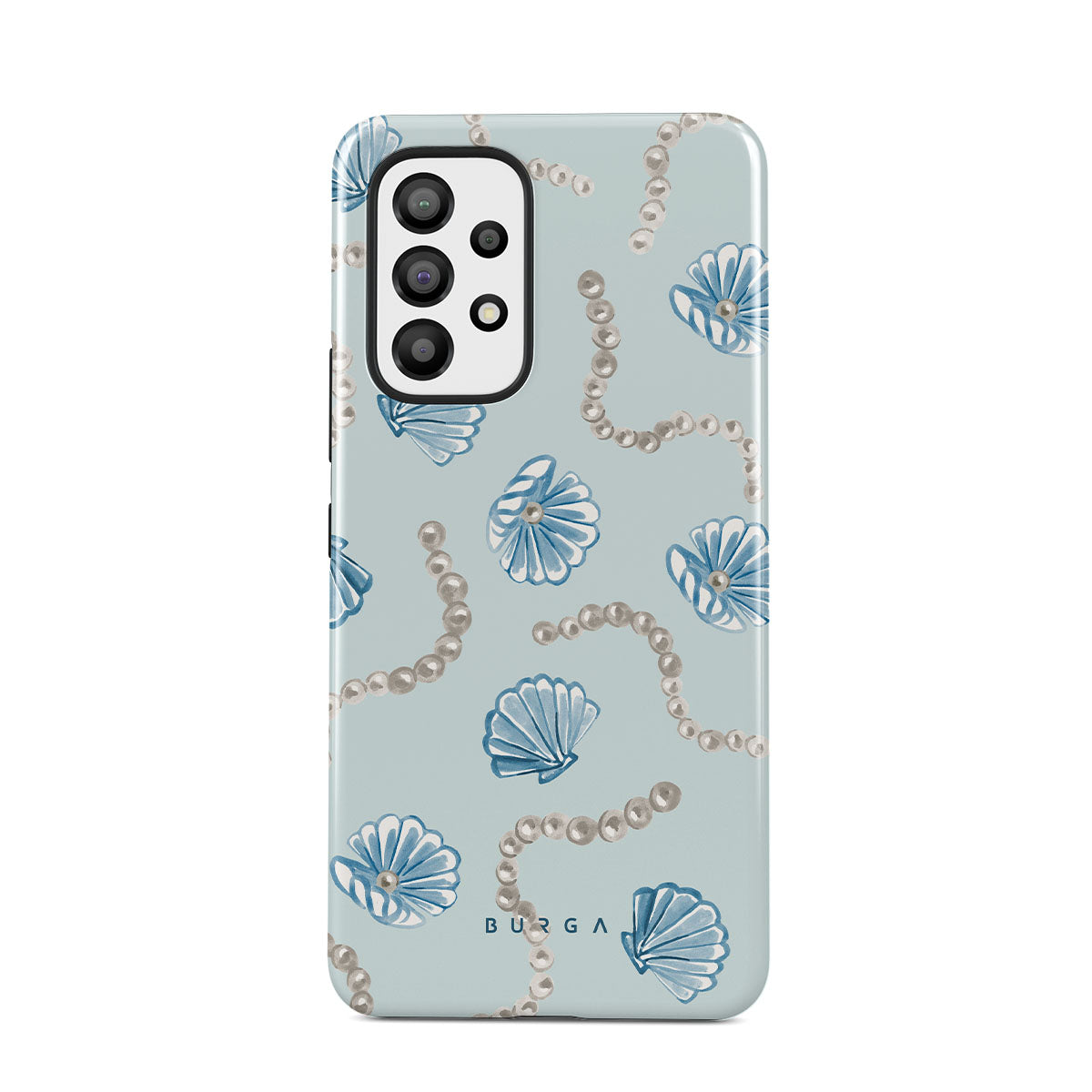 Questo design include: perle, conchiglie, sfondo azzurro chiaro, elementi marini.