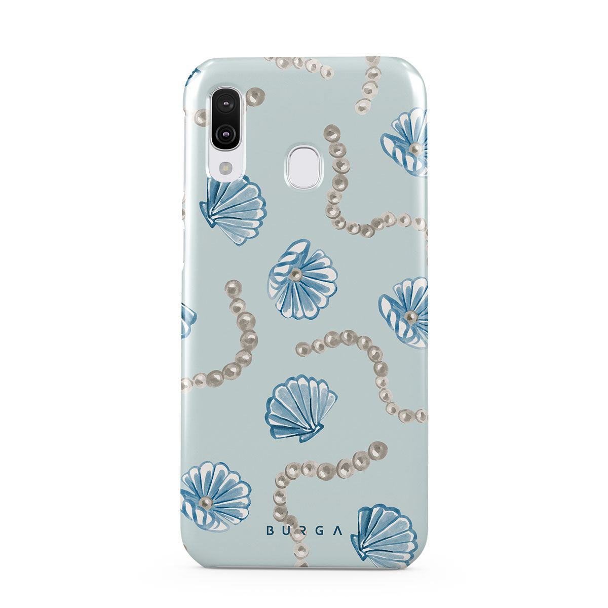 Questo design include: perle, conchiglie, sfondo azzurro chiaro, elementi marini.