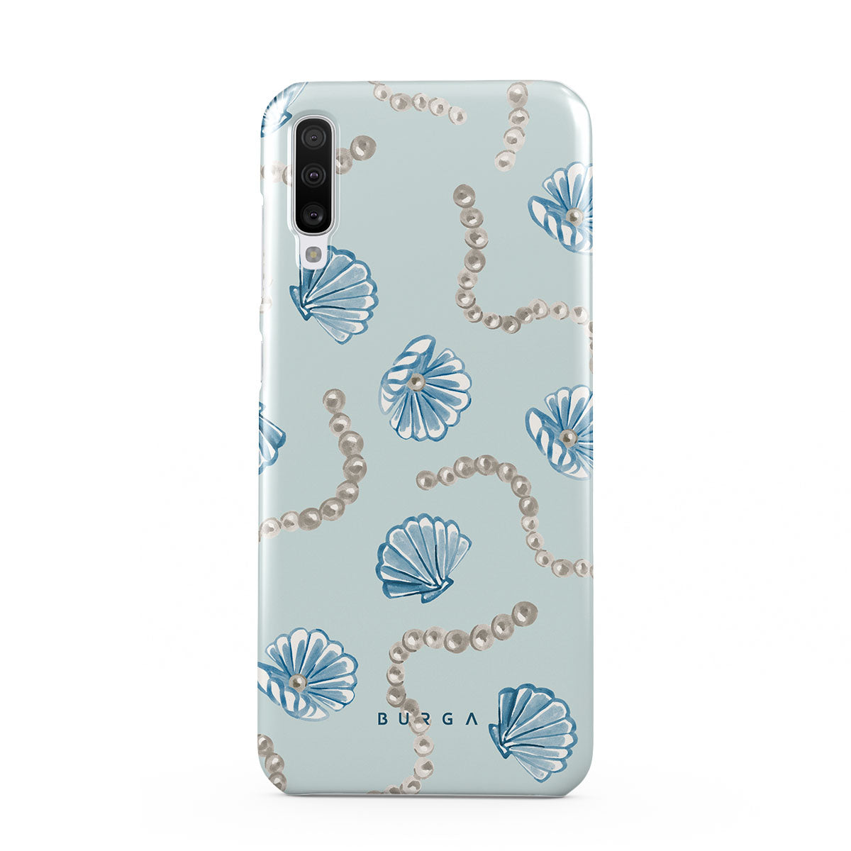 Questo design include: perle, conchiglie, sfondo azzurro chiaro, elementi marini.