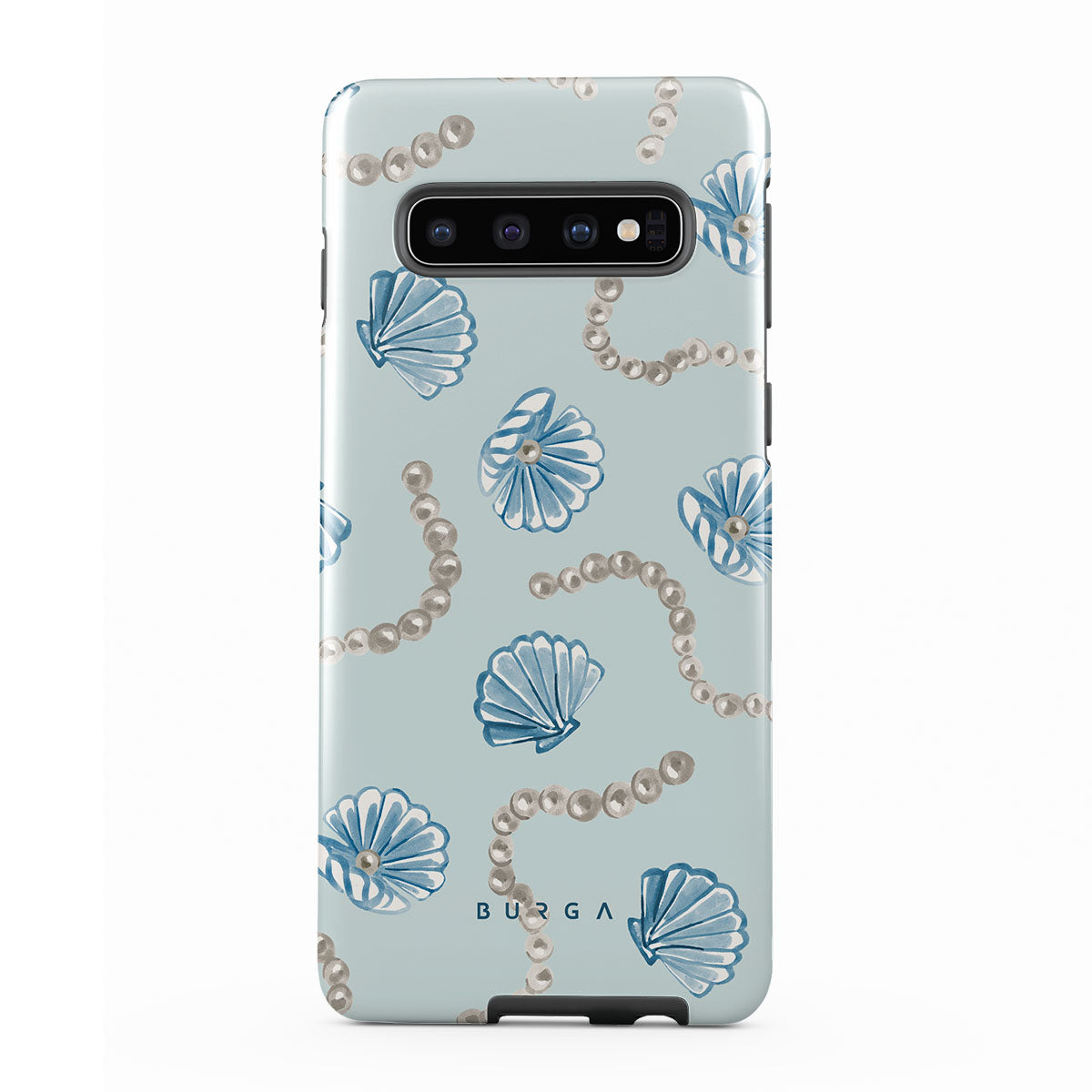 Questo design include: perle, conchiglie, sfondo azzurro chiaro, elementi marini.