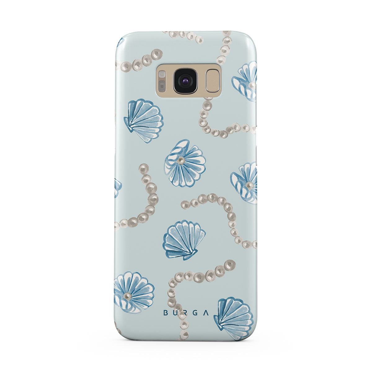 Questo design include: perle, conchiglie, sfondo azzurro chiaro, elementi marini.