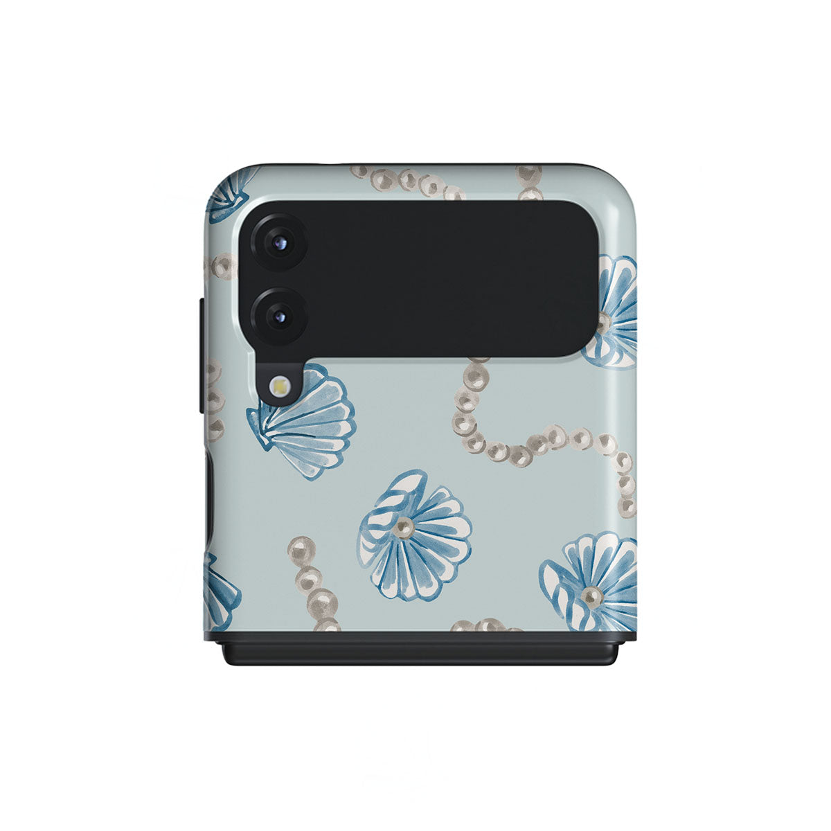 Questo design include: perle, conchiglie, sfondo azzurro chiaro, elementi marini.