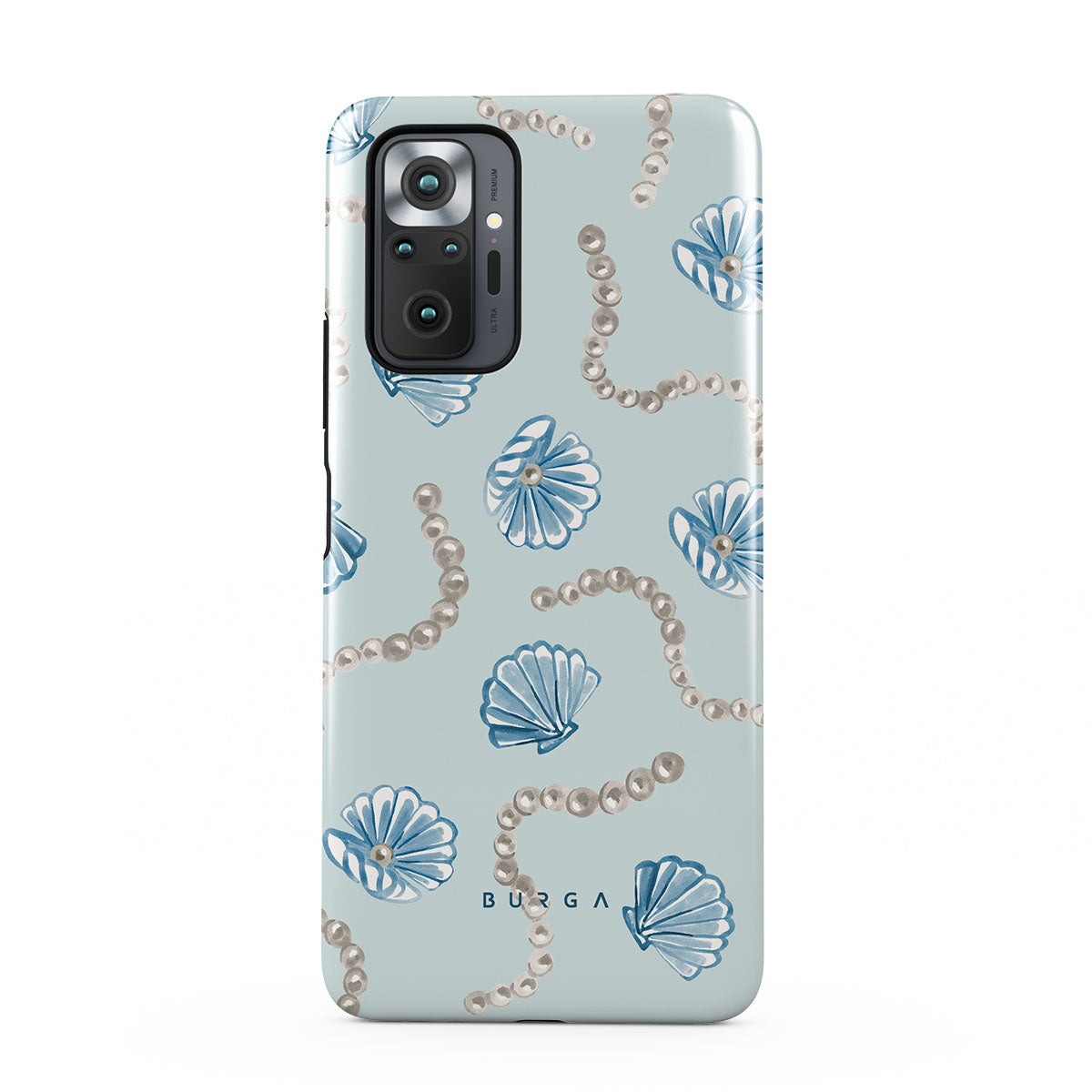 Questo design include: perle, conchiglie, sfondo azzurro chiaro, elementi marini.