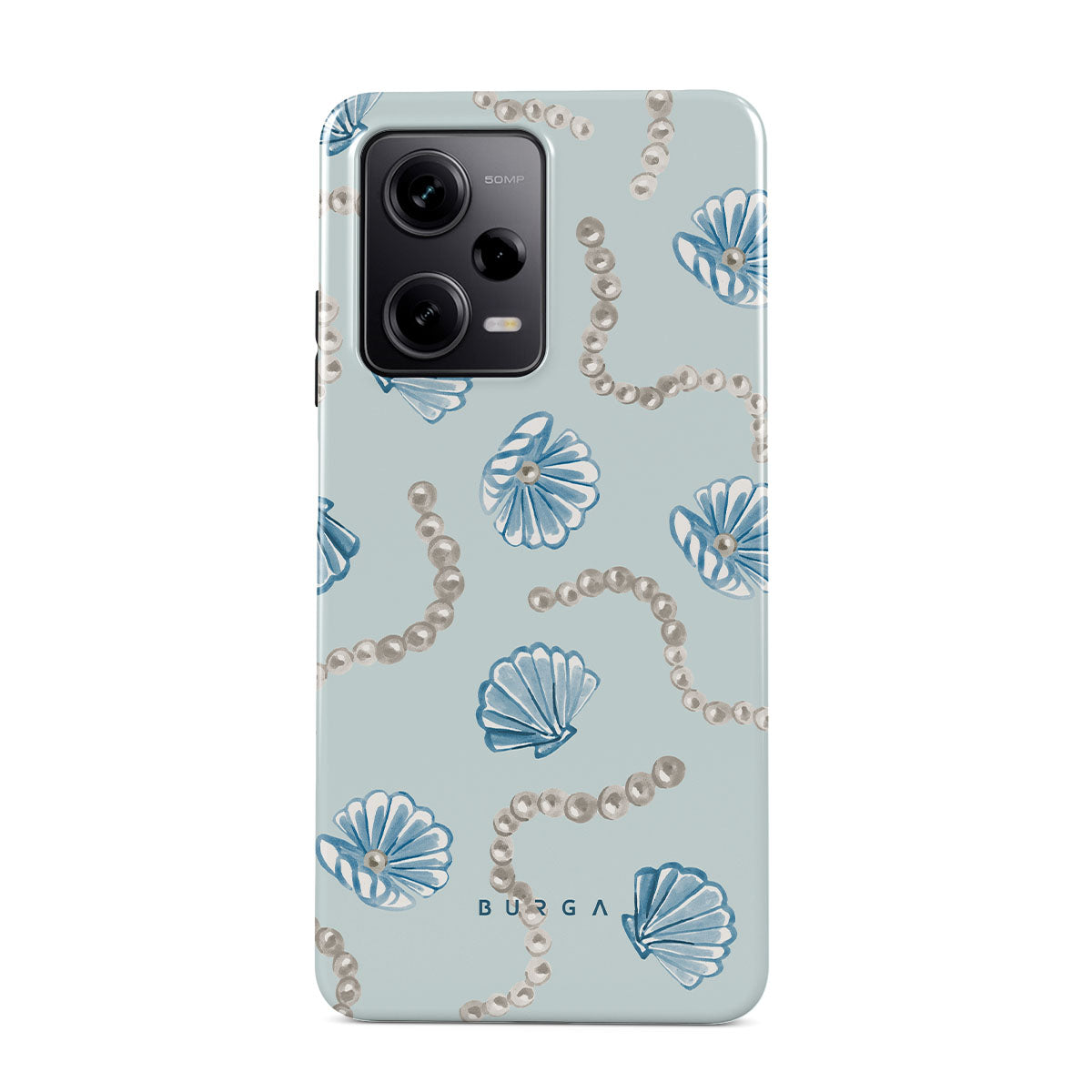 Questo design include: perle, conchiglie, sfondo azzurro chiaro, elementi marini.